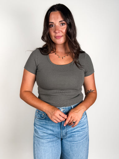 DESCRIPTION: Rounded Neckline Ribbed Short Sleeves SIZE & FIT: Style is fitted. Model is 5'9 and is wearing a size M. MATERIAL & CA...
