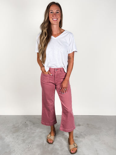 DESCRIPTION: Make a bold statement with these high rise ankle flare jeans, featuring a raw hem, side inset, and eye-catching contrast detail down...
