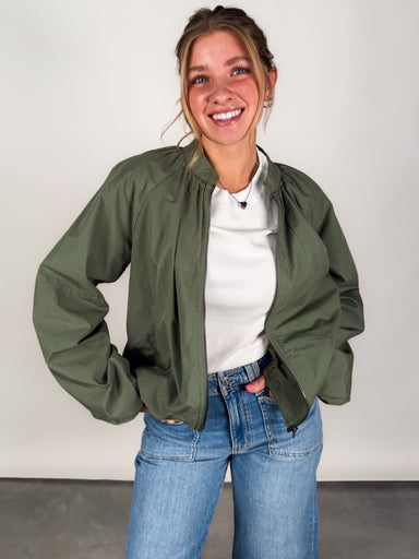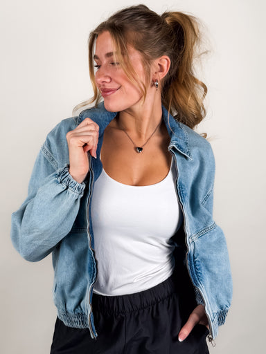 Best SellerDESCRIPTION: Long Sleeves Not Lined Front Zipper Closure Knit Fabrication with Denim Contrast SIZE & FIT: Style is relaxed. Model is 5'8 ...