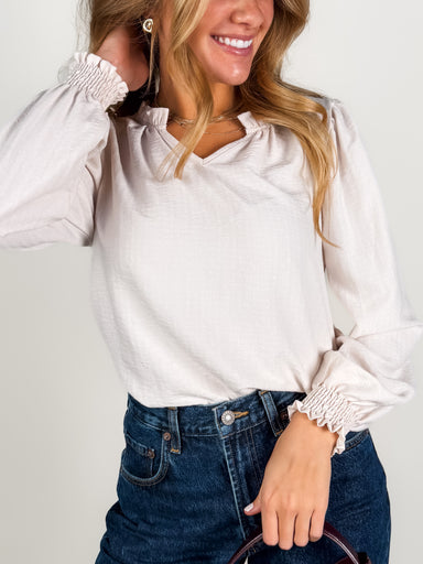 DESCRIPTION: Split Neckline with Ruffle Trim Smocked Cuffs Textured Fabrication SIZE & FIT: Style is relaxed. Model is 5'8 and is wearing...