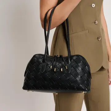 DESCRIPTION: Lotus Shoulder Bag — woven dome silhouette with long double straps. Woven exterior, secure zip-top closure with decorative pull cord...