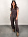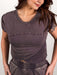 Features: Soft, jersey fabrication; relaxed fit; cropped muscle tee top with seaming detail; ankle length pant with high-rise waist and wide leg; elasticated waistband and cuffs; crossover detail on top; ribbed collar; side seam pockets