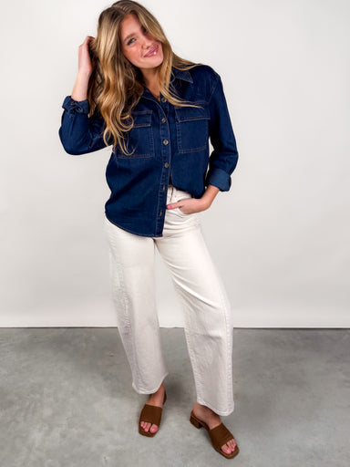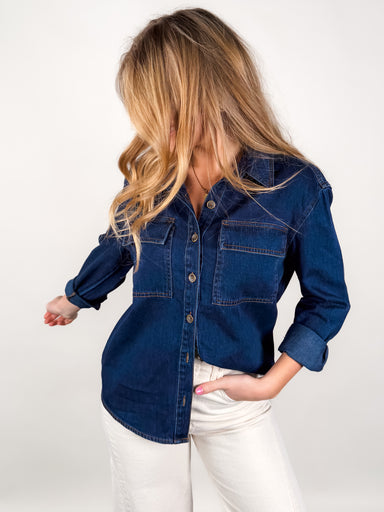 DESCRIPTION: Elevate your everyday style with this dark wash button front shirt, featuring long sleeves and subtle contrast thread detailing for ...