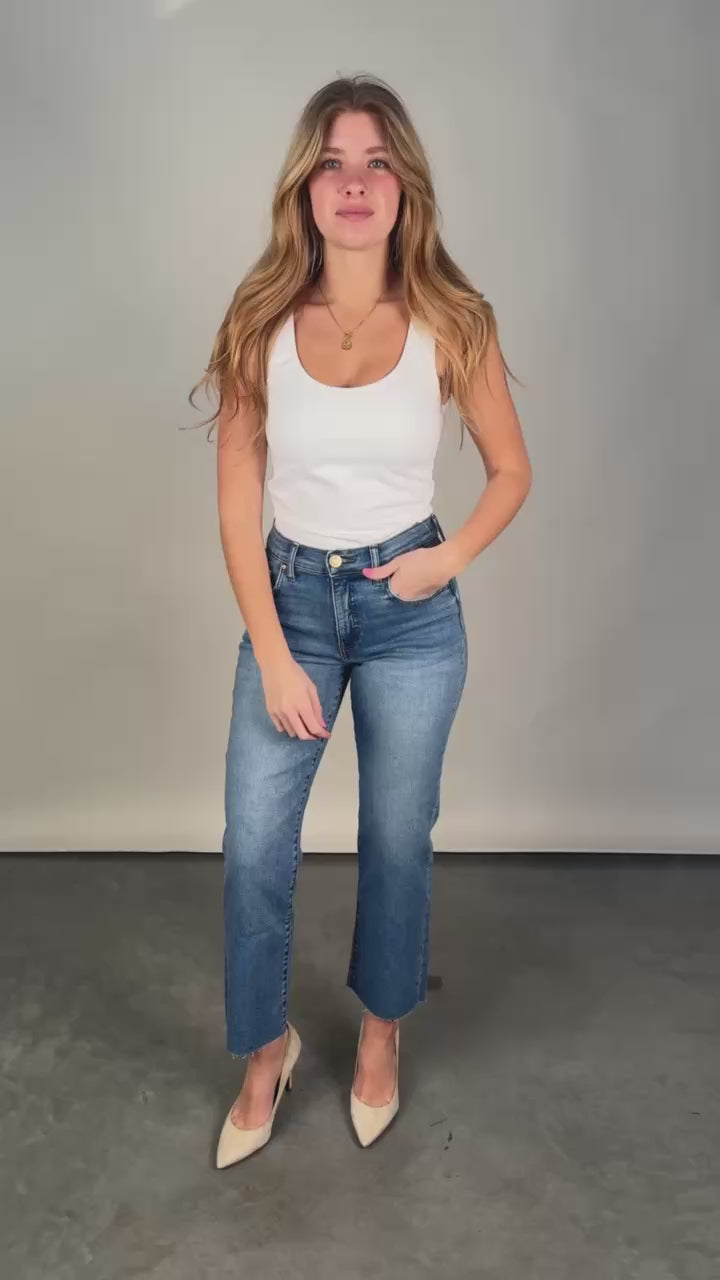 Designed with a flattering high rise and built-in Fab Ab pockets, these jeans smooth and support for a sleek silhouette. The easy straight leg and raw hem add a relaxed, modern edge to the medium wash finish. Crafted from soft, stretchy material, they offer all-day comfort without sacrificing style.