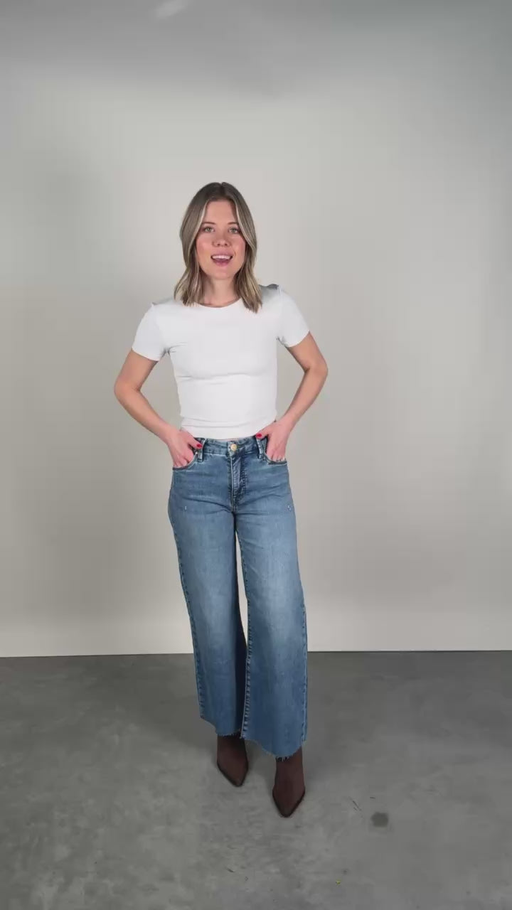 These high-rise wide leg jeans in a classic medium wash feature Fab Ab pockets for a smooth, flattering fit and stretchy fabric for all-day comfort. A raw hem and a hint of distressing give them a lived-in feel with a modern edge. Effortless and versatile, they’re your new go-to for casual cool.