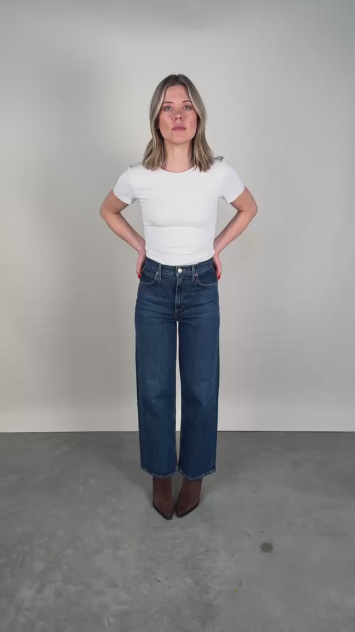 AGOLDE's Ren jeans are crafted from recycled cotton, offering a relaxed fit with a high-rise waist and cropped wide legs. These jeans are perfect for casual days, combining comfort with style. Pair them with a half-tucked tee or sleek bodysuit for an effortlessly chic look.