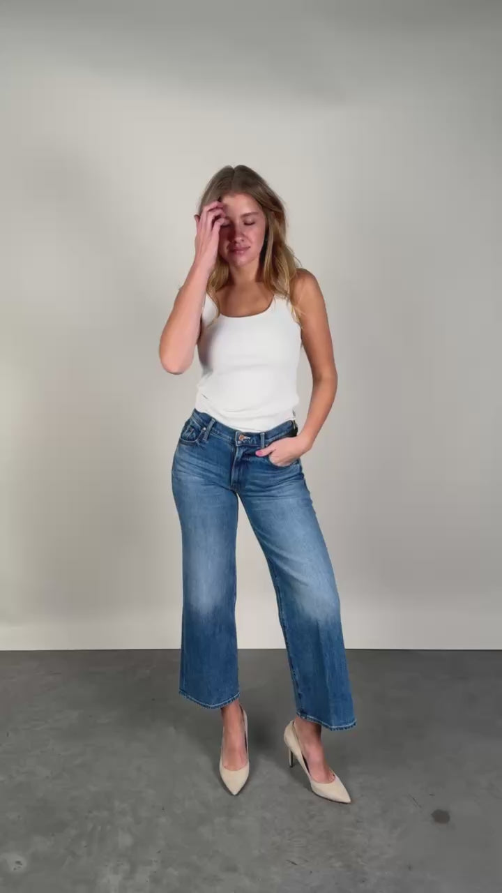 All in. Mid-rise jeans with a loose fit, wide leg, zip fly and ankle-length inseam with a clean hem. Made from stretch denim, All Your Eggs In One Basket is a mid blue with whiskering and fading at the knees.