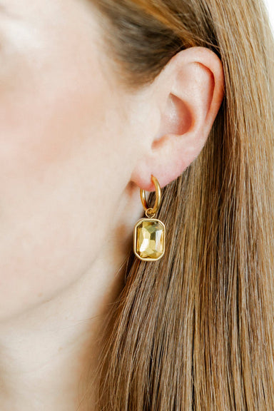 DESCRIPTION: Bring a warm, radiant glow to your look with the Diana Champagne Huggie Charm Earrings. Featuring a 16mm gold-tone hoop and a detach...