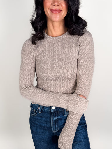 DESCRIPTION: Crew Neckline Long Sleeves Textured Fabrication SIZE & FIT: Style is fitted. Model is 5'4 and is wearing a size S. MATERIAL...