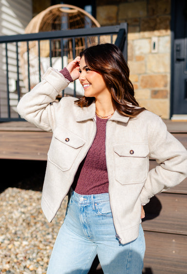 DESCRIPTION: Effortlessly cool in every way, this jacket is featured in a soft brushed fleece fabrication and boxy silhouette with patch pockets ...