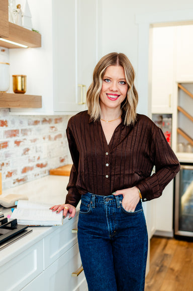 DESCRIPTION: Button Front V-Neckline Silky Fabrication Subtle Contrast Stripe Detail SIZE & FIT: Style is relaxed. Model is 5'5 wearing s...