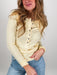 Features: Soft cotton fabrication with a stretchy feel, henley-style with button closures, fitted long-sleeves, exposed seam detailing, round hemline