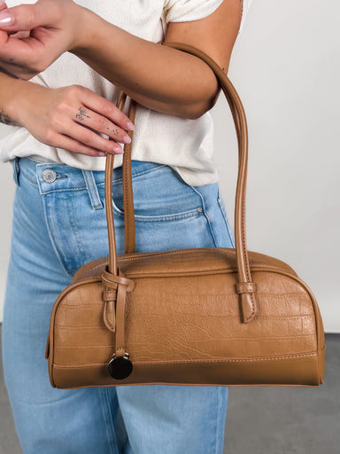 DESCRIPTION: Paloma croco shoulder bag — barrel silhouette with long double straps for chic, hands-free wear. Croc-embossed texture, structured b...