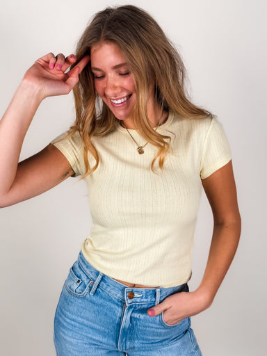 DESCRIPTION: The definition of an effortless essential, this timeless baby tee is featured in a classic baby tee silhouette with pointelle detail...