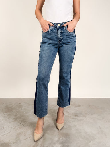 DESCRIPTION: Make a bold statement with these high rise ankle flare jeans, featuring a raw hem, side inset, and eye-catching contrast detail down...