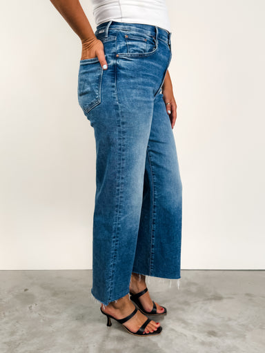 DESCRIPTION: Pleaser is our favorite magic word. The Pleaser in Indigo Wave is our tried and true high rise wide ankle in a dark blue indigo with...