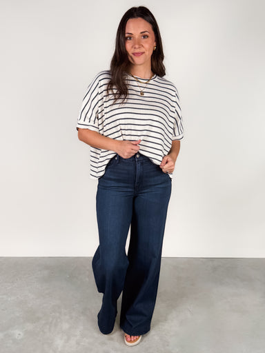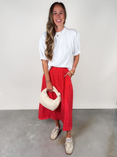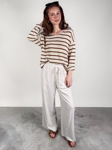 DESCRIPTION: Holiday Merchandise is Final Sale Elastic Waist Hidden Side Zipper Wide Leg Velvet Textured Fabrication Pair with the 'Velvet Avenu...