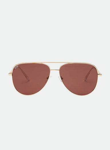 DESCRIPTION: A refined take on the classic aviator. The Era in Gold features a matte gold metal frame paired with a rich dark brown lens, balanci...