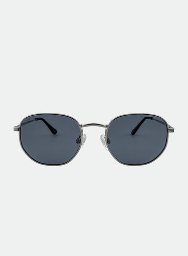 DESCRIPTION: A sleek hexagonal-shaped metal frame in polished silver, offering a modern twist on a classic design. The smoke lenses add a cool un...