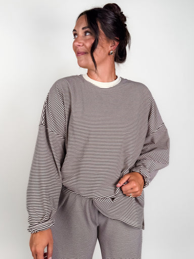 Best SellerDESCRIPTION: Crew Neckline Exposed Seam Details Ribbed Trims in Contrast Knit SIZE & FIT: Style is relaxed. Model is 5'9 wearing size M/L...