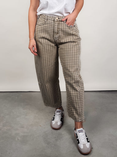 DESCRIPTION: Barrel Leg Mini Checker Pattern Functional Pockets SIZE & FIT: Model is 5'6 and is wearing a size S. MATERIAL & CARE: ...