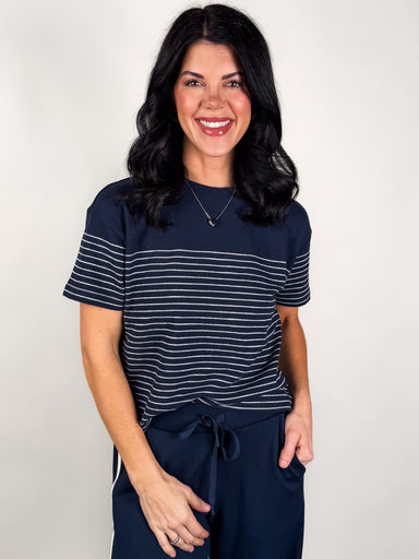 DESCRIPTION: This striped top features a textured knit blend in a relaxed silhouette. Pair with the Andre Wide Leg Pant for your most comfortabl...