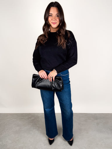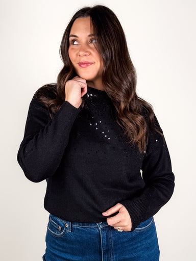 DESCRIPTION: Transform your wardrobe with this gorgeous black soft knit sweater featuring exquisite embellishments of shimmering sequins on the f...
