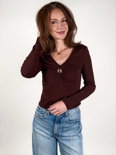 DESCRIPTION:   V-Neckline Cut Out Detail with Gathering at Neckline Long Sleeves Fitted SIZE & FIT:     MATERIAL & CARE:   43% Rayon, 33%...