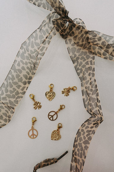 DESCRIPTION: one pair of leopard sheer shoelaces length of laces: 25 inches 6 charms: 2 peace signs, 2 hearts, 2 shamrocks gold hardware jewelry...