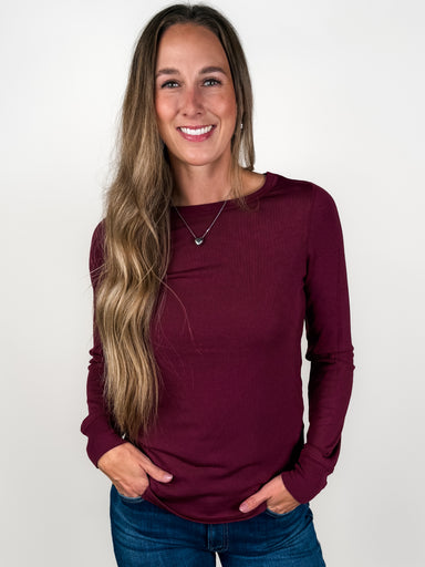 DESCRIPTION: Rounded Neckline Long Sleeves Small Rib Knit Soft Fabrication SIZE & FIT: Style is fitted. Model is 5'9 and is wearing a siz...