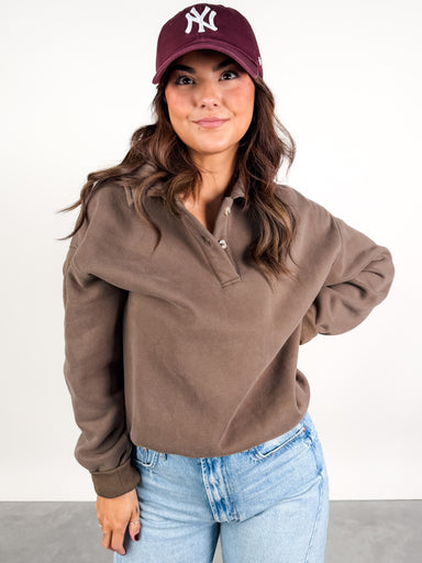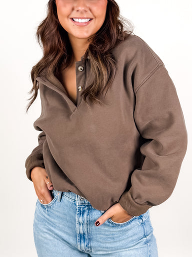 DESCRIPTION: A cozy classic, this sweatshirt is featured in a soft garment dyed fabrication with a half button neckline and oversized fit. Co...