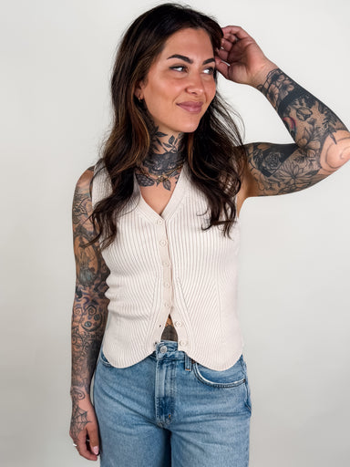 SIZE & FIT: Model is 5'7 wearing size S. MATERIAL & CARE: 100% Cotton | Wash Cold DESCRIPTION: Textured Knit Button Front Sleeveless...