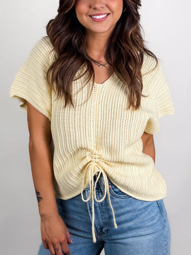 SIZE & FIT: Model is 5'5 wearing size S. MATERIAL & CARE: 60% Cotton, 40% Acrylic | Hand Wash Cold DESCRIPTION: V-Neckline Contrast Kn...