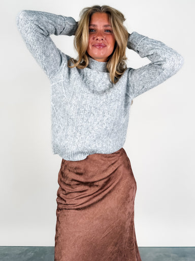 DESCRIPTION: High Neck Dropped Shoulder Cable Knit Details Ribbed Trims SIZE & FIT: Style is relaxed. Model is 5'8 and is wearing a size ...