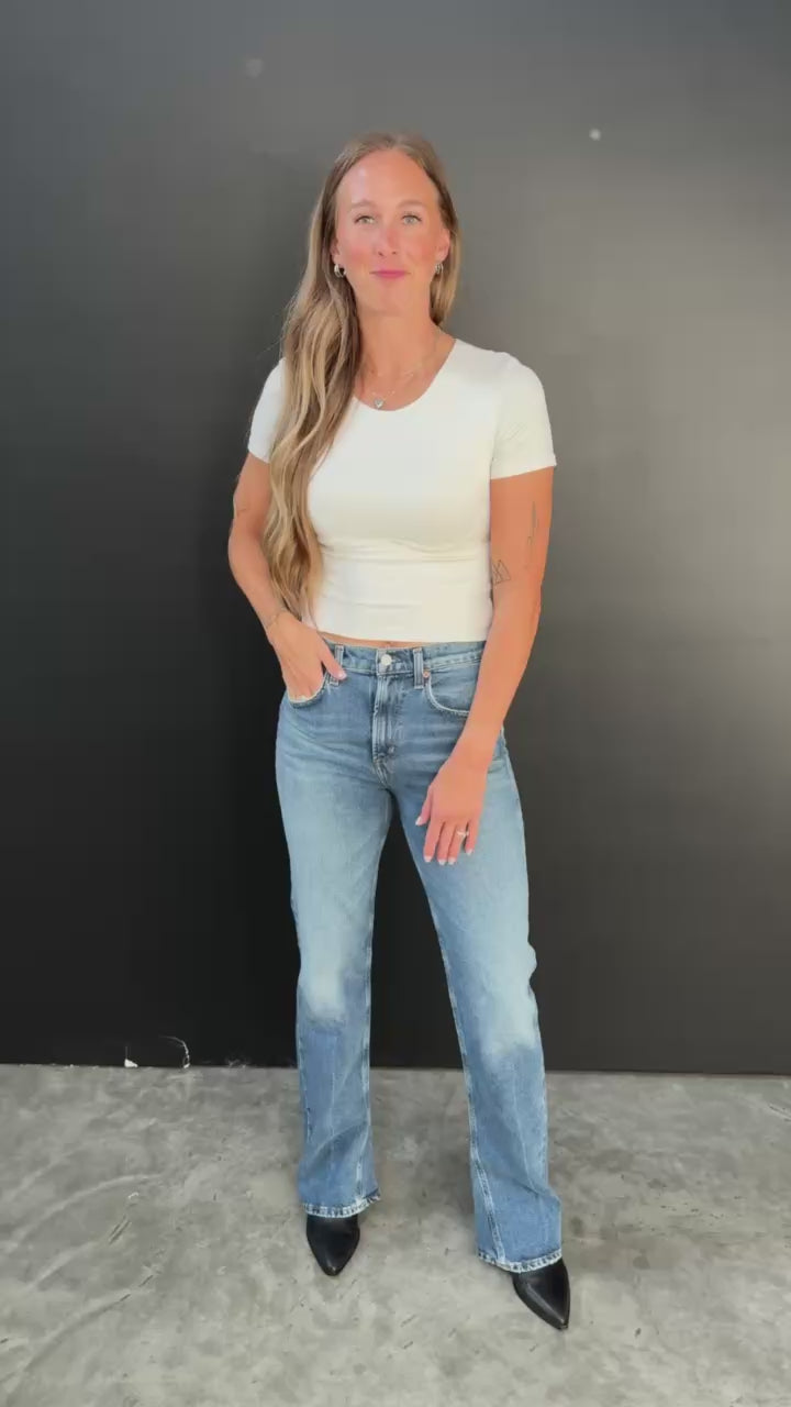 A modern bootcut with a mid-rise waist, this silhouette fits slim through the hip and opens into a subtle kick at the hem. Crafted from comfort stretch regenerative cotton denim with a soft hand, it’s finished in a medium indigo wash with worn-in fading and whiskering for an authentically vintage feel. Pair with a slim knit or boxy tee to strike the right balance.