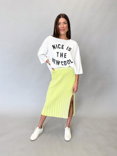 DESCRIPTION: High rise Midi Length Elastic waistband Midweight Heavy soft wash Regular fit SIZE & FIT: Skirt length is 35" Style is fit...